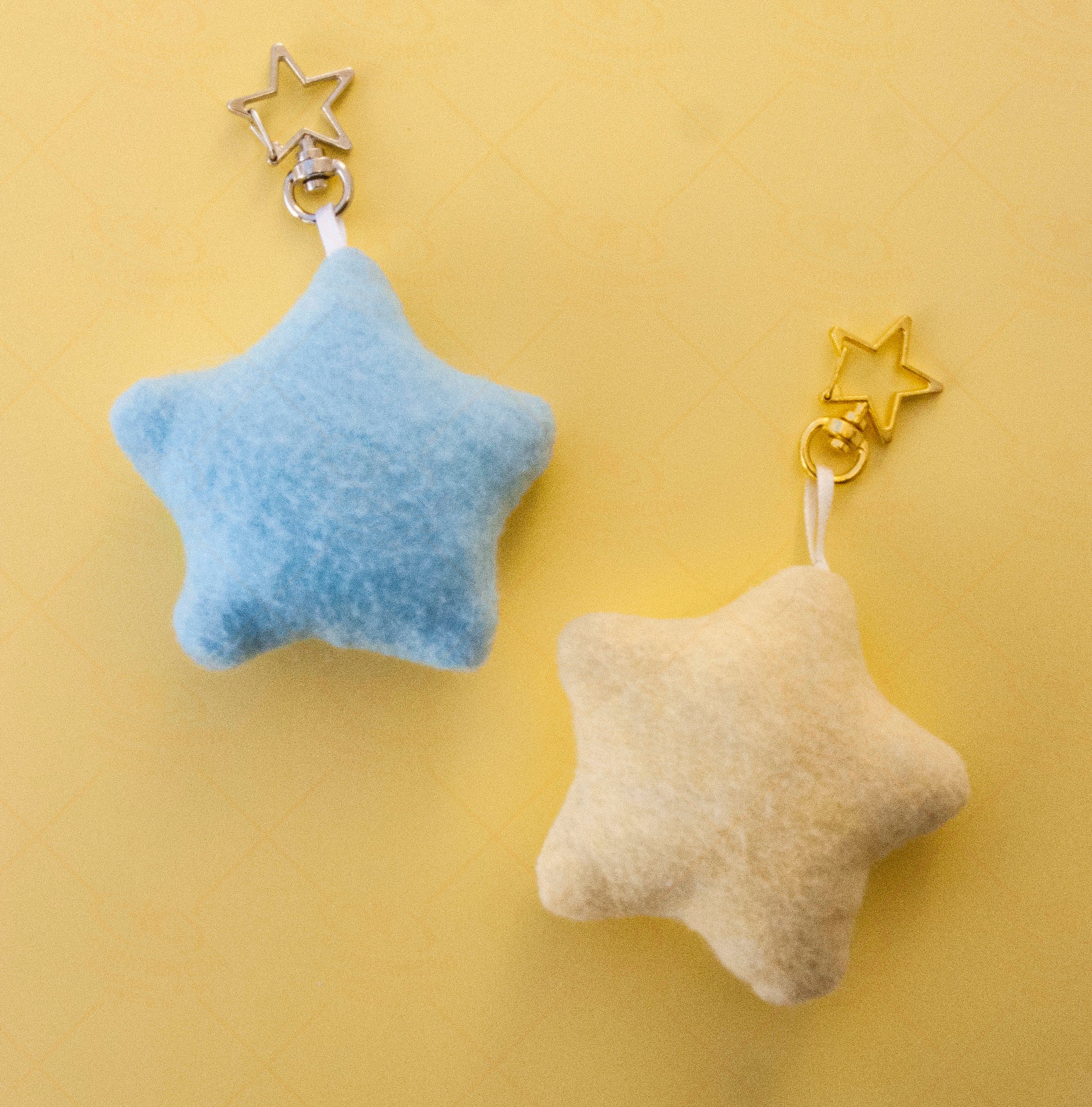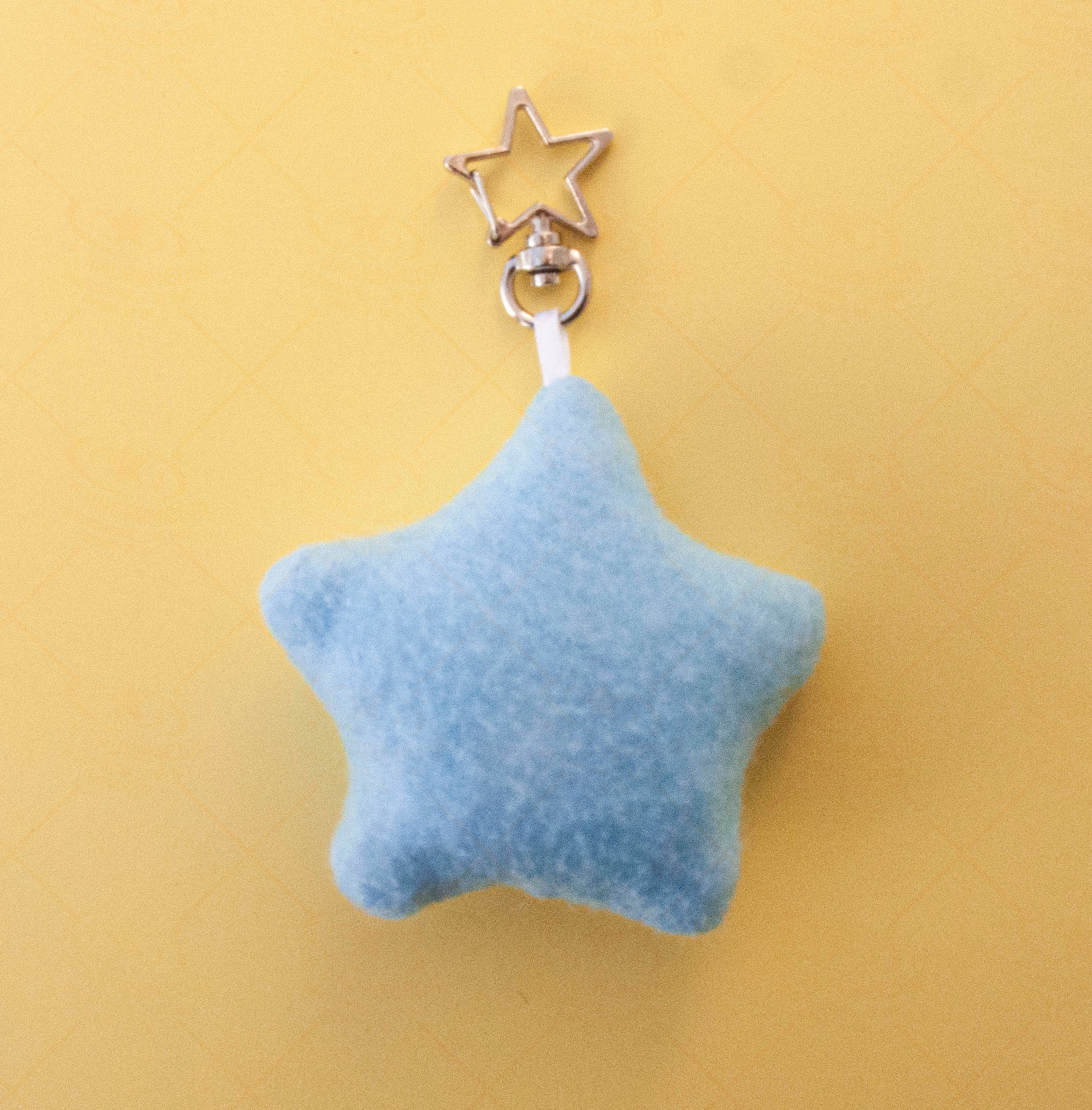 Handmade plush keychain in the shape of a star. Comes in either pastel blue or pastel yellow